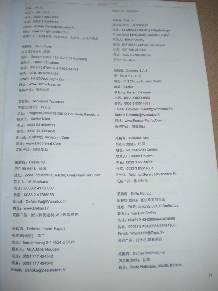 資料如何收集:在各大展會上,我們免費向到會采購商提供他們需要的最新產(chǎn)品雜志和光盤,我們也同時向他們派發(fā)帶有我們網(wǎng)站LOGO的精美禮品,這些最新的中國供應商的信息,對他們很有幫助,采購商會留下他們的名片,填寫詳細的產(chǎn)品求購信息,以期望得到更多的供應商的信息。收集到這些第一手的原始外商資料后,我們客戶服務中心立刻將名片掃描作成圖片,將產(chǎn)品采購信息做成數(shù)據(jù)庫,將采購商資料按行業(yè)不同,匯編成冊,出版發(fā)行《全球采購商黃頁》系列。
