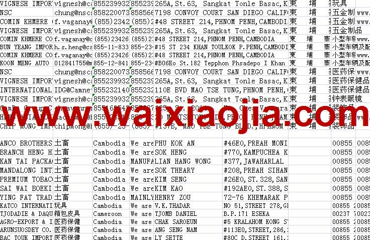 柬埔寨采購(gòu)商黃頁(yè)包括:企業(yè)名稱、電子郵箱、聯(lián)系電話、傳真、聯(lián)系地址、聯(lián)系人、郵編等信息。