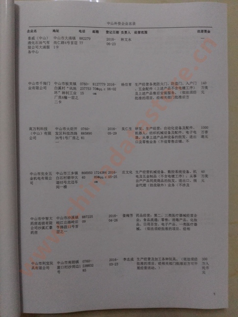 最新中山外資企業(yè)黃頁(yè)涵蓋了中山外商獨(dú)資企業(yè)、中外合資經(jīng)營(yíng)企業(yè)以及港、澳、臺(tái)資企業(yè),包括中山臺(tái)資日資企業(yè)黃頁(yè),中山外資公司黃頁(yè)具體內(nèi)容包括:企業(yè)名稱、地址、電話、傳真、郵箱、經(jīng)營(yíng)范圍、注冊(cè)資金等信息;中山外資企業(yè)名單里面的企業(yè)都一些中外合資的大企業(yè),這些公司經(jīng)濟(jì)實(shí)力都比較雄厚,出口產(chǎn)品也比較多,業(yè)務(wù)范圍都比較廣,跟他們開展業(yè)務(wù)往來(lái)都比較容易;有了中山臺(tái)企日企黃頁(yè)開展業(yè)務(wù)也有了針對(duì)性,也省去了盲目去尋找客戶名單而浪費(fèi)的時(shí)間了,工作效率也會(huì)有很大的提高.歡迎需要的客戶及時(shí)聯(lián)系我們!