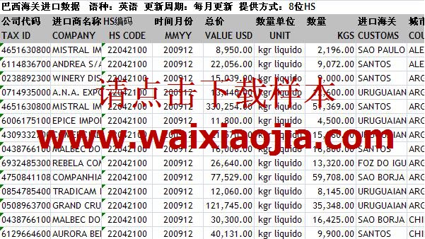 巴西進(jìn)口、出口提單數(shù)據(jù),以巴西本土企業(yè)向全球 200 多個(gè)國家和地區(qū)進(jìn)口各類商品的提貨單為依據(jù)。按照具體產(chǎn)品的精確 HS 編碼提供。 內(nèi)容包括:貿(mào)易方向(進(jìn)口、出口)、巴西進(jìn)口商企業(yè)、各國出口商企業(yè)、 HS 編碼、產(chǎn)品描述、提單描述、貿(mào)易方式、產(chǎn)品重量、數(shù)量、數(shù)量單位、總金額、集裝箱尺寸、抵達(dá)港口、到港日期、月份、中轉(zhuǎn)國、中轉(zhuǎn)港口、原產(chǎn)地、國際港口名稱、船公司、代理公司、通知人等信息。