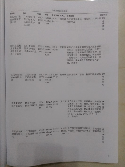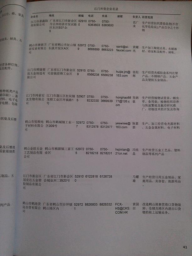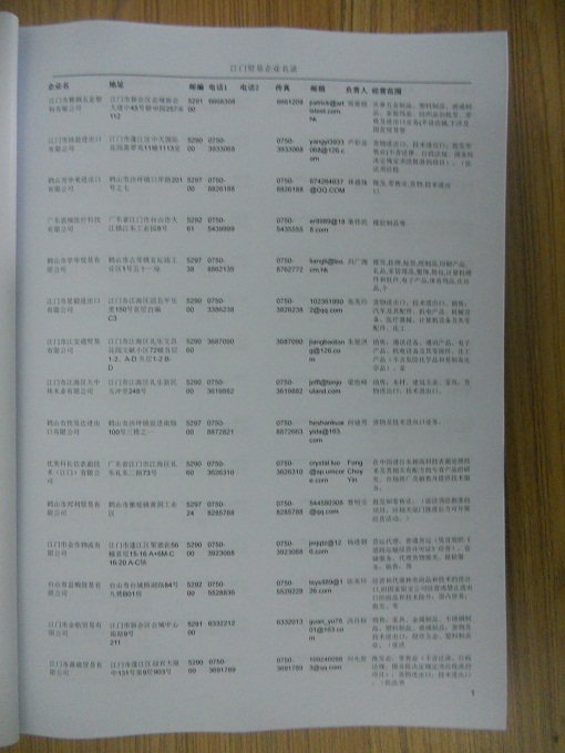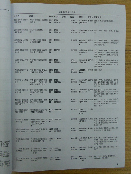 2021版最新江門企業(yè)黃頁(yè)包括《江門制造企業(yè)黃頁(yè)》、《江門貿(mào)易企業(yè)黃頁(yè)》、《江門民營(yíng)企業(yè)黃頁(yè)》、《江門外資企業(yè)黃頁(yè)》、《江門外貿(mào)企業(yè)黃頁(yè)》共五冊(cè),現(xiàn)優(yōu)惠價(jià):280元/冊(cè)。每?jī)?cè)內(nèi)容包括:?jiǎn)挝幻Q、地址、郵編、電話、傳真、郵箱、經(jīng)營(yíng)范圍等;江門企業(yè)黃頁(yè)涵蓋了近幾年來(lái)最新成立的、有一定規(guī)模的企業(yè),具有非常高的營(yíng)銷價(jià)值。有了這套黃頁(yè)開(kāi)展業(yè)務(wù)也有了針對(duì)性,也省去了盲目去尋找客戶名單而浪費(fèi)的時(shí)間了,工作效率也會(huì)有很大的提高。歡迎需要江門企業(yè)黃頁(yè)的朋友及時(shí)聯(lián)系我們!