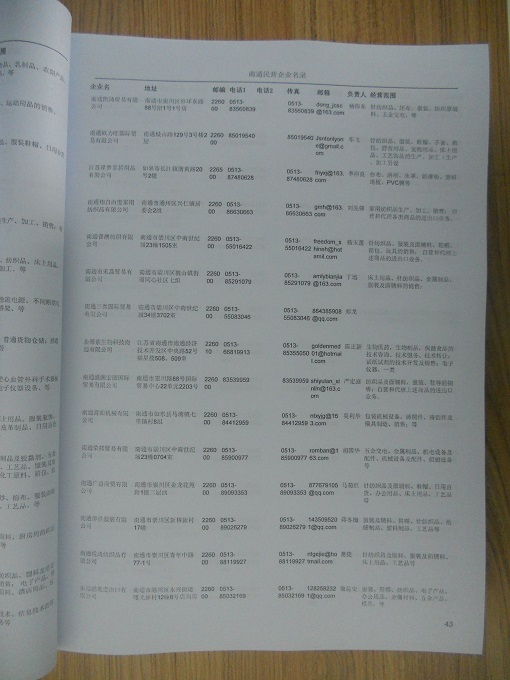 2021版最新南通企業(yè)黃頁包括《南通制造企業(yè)黃頁》、《南通貿(mào)易企業(yè)黃頁》、《南通民營企業(yè)黃頁》、《南通外資企業(yè)黃頁》、《南通外貿(mào)企業(yè)黃頁》共五冊,現(xiàn)優(yōu)惠價:280元/冊。每冊內(nèi)容包括:單位名稱、地址、郵編、電話、傳真、郵箱、經(jīng)營范圍等;南通企業(yè)黃頁涵蓋了近幾年來最新成立的、有一定規(guī)模的企業(yè),具有非常高的營銷價值。有了這套黃頁開展業(yè)務(wù)也有了針對性,也省去了盲目去尋找客戶名單而浪費的時間了,工作效率也會有很大的提高。歡迎需要南通企業(yè)黃頁的朋友及時聯(lián)系我們!