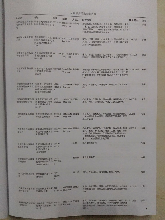 2025年新版中國家具采購企業(yè)黃頁,收錄了全國各地經營范圍涉及家具產品的貿易企業(yè),這些都是頗具實力的家具產品的中國采購商。黃頁內容包含:企業(yè)名稱、地址、電話、傳真、郵箱、經營范圍、省份、注冊資金等信息。該套黃頁包含一個黃頁光碟加一冊紙質書刊,全國價格:1500元元,省/直轄市價格:400元元,城市價格:200元,共收錄了全國各地大概28419(統(tǒng)計日期:2018.1)家具產品采購企業(yè)。黃頁光碟中是EXCEL格式,信息可任意修改、復制、打印、導出及導入到傳真、郵件群發(fā)等軟件中,無任何限制。