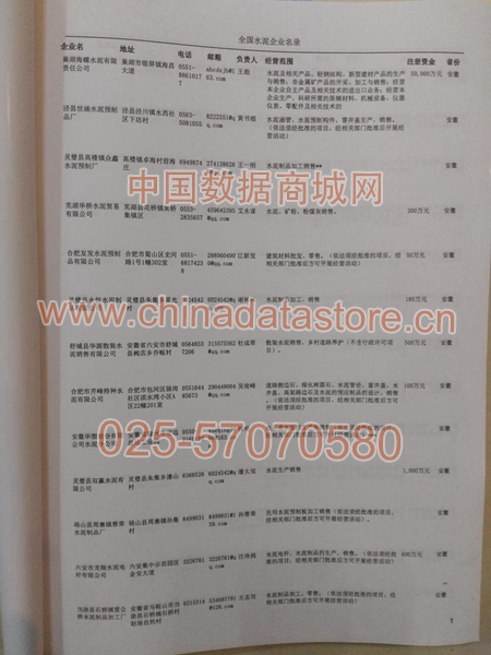 最新水泥生產(chǎn)與貿(mào)易企業(yè)黃頁數(shù)據(jù)更新日期2025年12月最新,全國水泥企業(yè)名單共35110條,都是具有一定規(guī)模的水泥行業(yè)的注冊實(shí)體企業(yè),數(shù)據(jù)準(zhǔn)確率高,是您開展各項營銷活動的必備資料。水泥企業(yè)黃頁包括:企業(yè)名稱、地址、電話、傳真、郵箱、登記日期、經(jīng)營范圍、注冊資金等信息。水泥企業(yè)名單數(shù)據(jù)為Excel格式,信息可任意修改、復(fù)制、打印、導(dǎo)出及導(dǎo)入到傳真、郵件群發(fā)等水泥中,無任何限制。