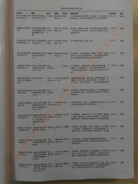 2025年新版中國汽配采購企業(yè)黃頁,收錄了全國各地經(jīng)營范圍涉及汽配產(chǎn)品的貿(mào)易企業(yè),這些都是頗具實(shí)力的汽配產(chǎn)品的中國采購商。黃頁內(nèi)容包含:企業(yè)名稱、地址、電話、傳真、郵箱、經(jīng)營范圍、省份、注冊(cè)資金等信息。該套黃頁包含一個(gè)黃頁光碟加一冊(cè)紙質(zhì)書刊,全國價(jià)格:1500元,省/直轄市價(jià)格:400元,城市價(jià)格:200元,共收錄了全國各地大概8952(統(tǒng)計(jì)日期:2018.1)家汽配產(chǎn)品采購企業(yè)。黃頁光碟中是EXCEL格式,信息可任意修改、復(fù)制、打印、導(dǎo)出及導(dǎo)入到傳真、郵件群發(fā)等軟件中,無任何限制。
