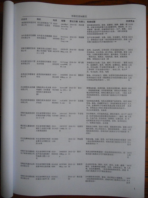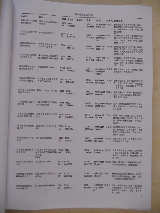 2021版最新邯鄲企業(yè)黃頁包括《邯鄲制造企業(yè)黃頁》、《邯鄲民營企業(yè)黃頁》,現(xiàn)優(yōu)惠價:280元/冊。每冊內容包括:單位名稱、地址、郵編、電話、傳真、郵箱、經營范圍等;邯鄲企業(yè)黃頁涵蓋了近幾年來最新成立的、有一定規(guī)模的企業(yè),具有非常高的營銷價值。有了這套黃頁開展業(yè)務也有了針對性,也省去了盲目去尋找客戶名單而浪費的時間了,工作效率也會有很大的提高。歡迎需要邯鄲企業(yè)黃頁的朋友及時聯(lián)系我們!