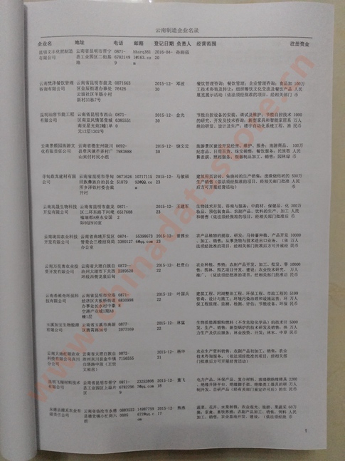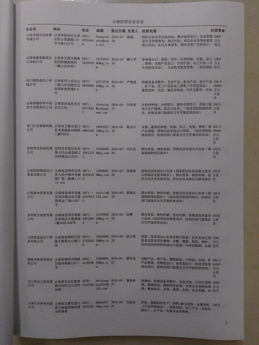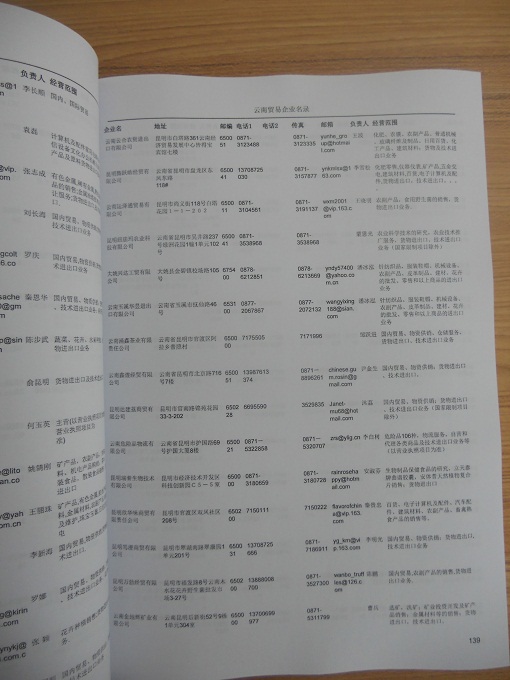2021版最新云南企業(yè)黃頁包括《云南制造企業(yè)黃頁》、《云南貿(mào)易企業(yè)黃頁》、《云南民營企業(yè)黃頁》共三冊,優(yōu)惠價(jià):280元/冊。每冊內(nèi)容包括:單位名稱、地址、郵編、電話、傳真、郵箱、經(jīng)營范圍等;云南企業(yè)黃頁涵蓋了近幾年來最新成立的、有一定規(guī)模的企業(yè),具有非常高的營銷價(jià)值。有了這套黃頁開展業(yè)務(wù)也有了針對性,也省去了盲目去尋找客戶名單而浪費(fèi)的時間了,工作效率也會有很大的提高。歡迎需要云南企業(yè)黃頁的朋友及時聯(lián)系我們!