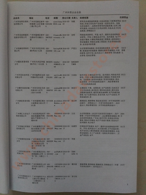 廣州外貿(mào)企業(yè)黃頁包括:外貿(mào)企業(yè)名稱、地址、電話、傳真、郵箱、經(jīng)營(yíng)范圍、注冊(cè)資金等信息。