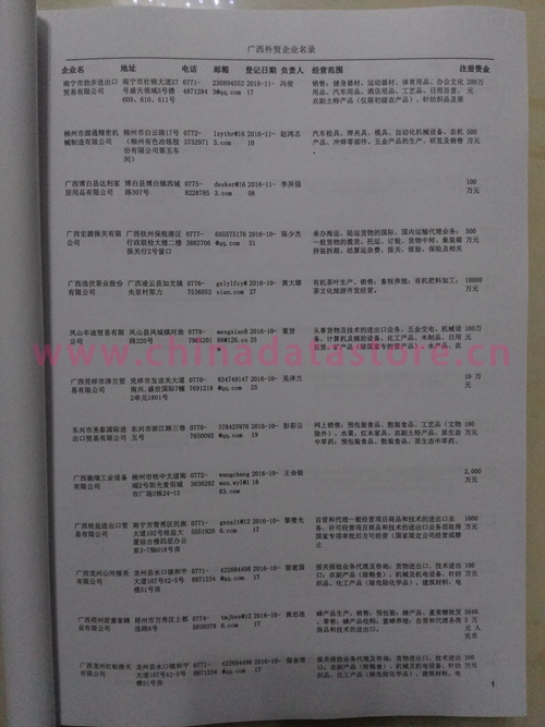 廣西外貿(mào)企業(yè)黃頁包括:外貿(mào)企業(yè)名稱、地址、電話、傳真、郵箱、經(jīng)營范圍、注冊資金等信息。