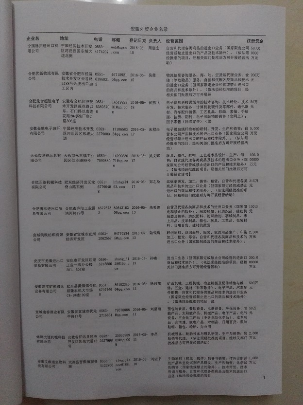 安徽外貿(mào)企業(yè)黃頁(yè)包括:外貿(mào)企業(yè)名稱、地址、電話、傳真、郵箱、經(jīng)營(yíng)范圍、注冊(cè)資金等信息。