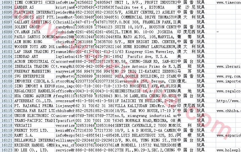 玩具采購(gòu)商名單數(shù)據(jù)為Excel格式,信息可任意修改、復(fù)制、打印、導(dǎo)出及導(dǎo)入到傳真、郵件群發(fā)等軟件中,無(wú)任何限制。