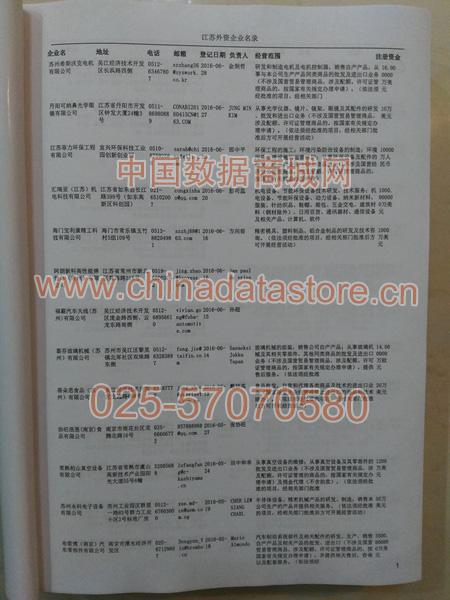 最新江蘇外資企業(yè)黃頁數(shù)據(jù)涵蓋了江蘇外商獨(dú)資企業(yè)、中外合資經(jīng)營(yíng)企業(yè)以及港、澳、臺(tái)資企業(yè),包括江蘇臺(tái)資日資企業(yè)黃頁,江蘇外企黃頁具體內(nèi)容包括:企業(yè)名稱、地址、電話、傳真、郵箱、經(jīng)營(yíng)范圍、注冊(cè)資金等信息;江蘇外資企業(yè)黃頁里面的企業(yè)都一些中外合資的大企業(yè),這些公司經(jīng)濟(jì)實(shí)力都比較雄厚,出口產(chǎn)品也比較多,業(yè)務(wù)范圍都比較廣,跟他們開展業(yè)務(wù)往來都比較容易;有了江蘇臺(tái)企日企黃頁開展業(yè)務(wù)也有了針對(duì)性,也省去了盲目去尋找客戶名單而浪費(fèi)的時(shí)間了,工作效率也會(huì)有很大的提高.歡迎需要的客戶及時(shí)聯(lián)系我們!